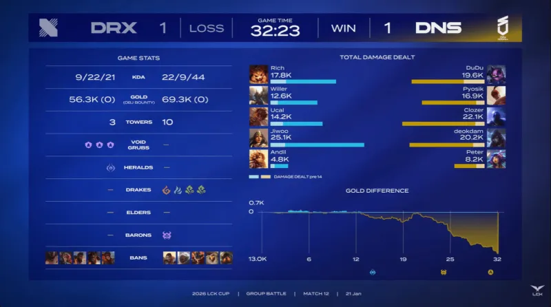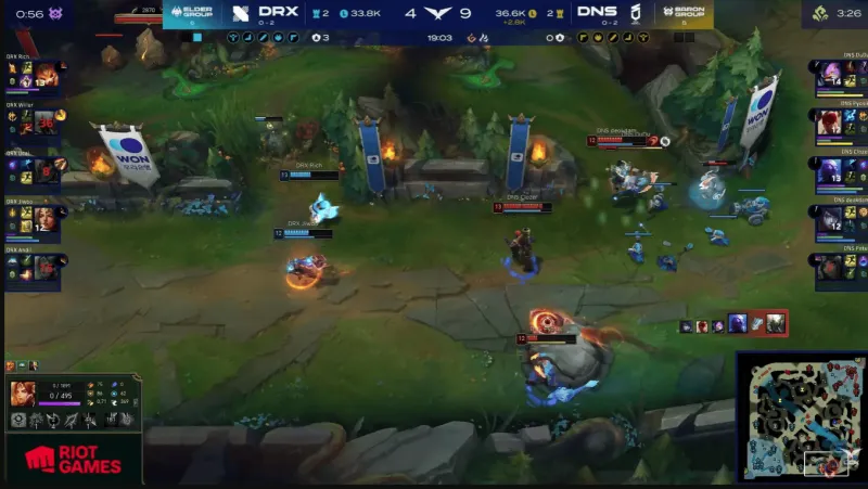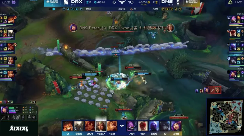 第二十三分钟:双方围绕小龙展开争夺,DRX野辅尝试绕后未果,侧翼希维尔追击过深被击杀,随后DNS团战打出一换二并拿下小龙