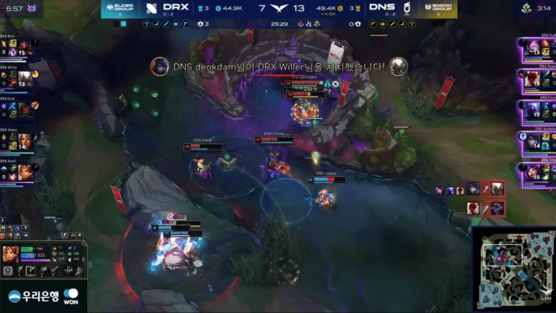 第三十一分钟:DRX主动出击未果,被DNS团战打出一换五,DNS顺势一波结束比赛