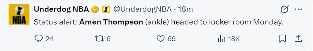 阿门第四节还剩4分多钟因为脚踝伤势返回更衣室。