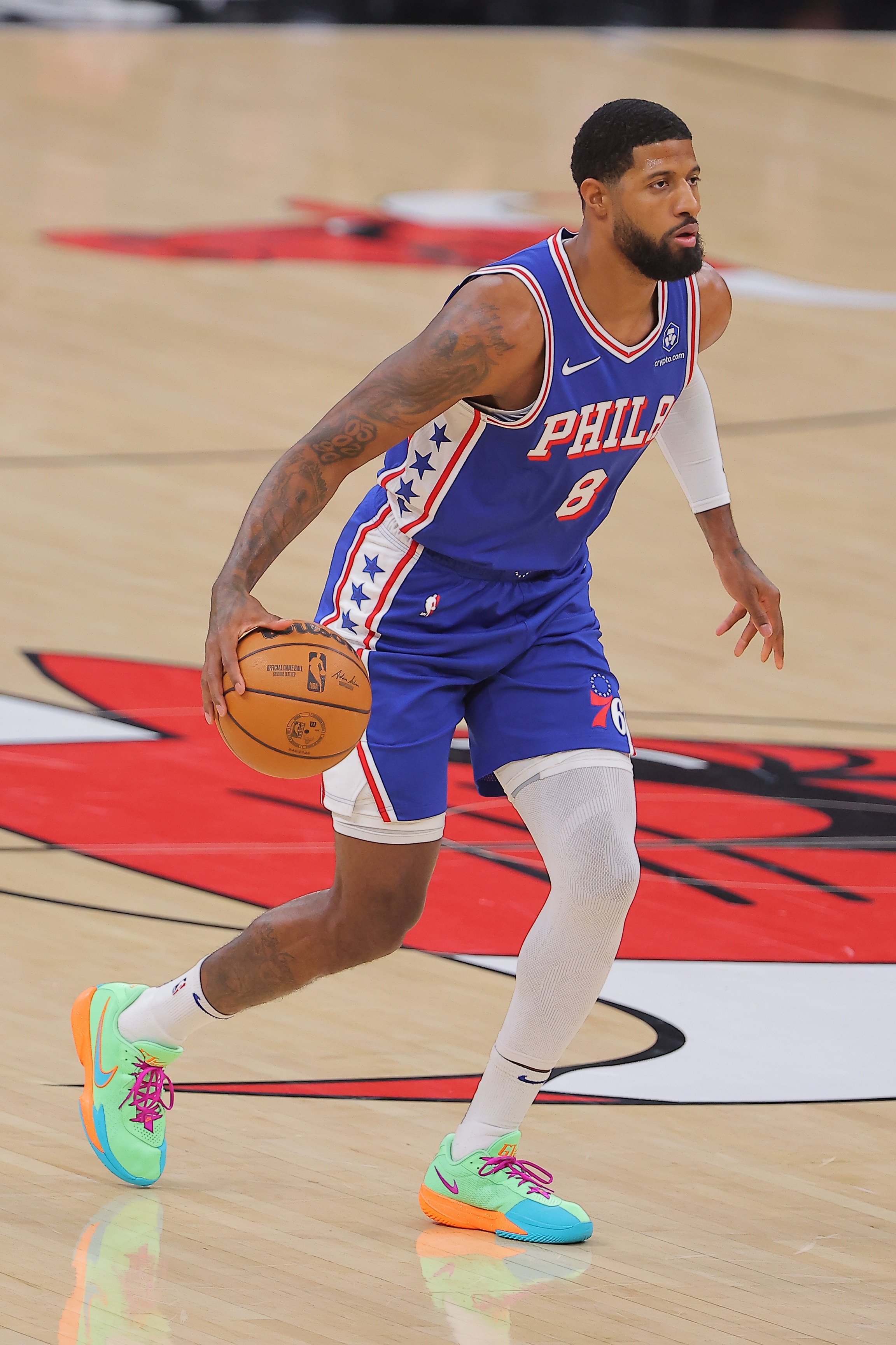 76人球员乔治本场比赛表现一般,他上半场表现还行,第三节状态明显下滑,投篮不中的同时也频频出现失误。